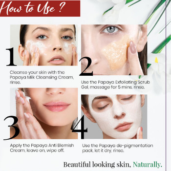 The Facial kit consists of 4 steps, they are, Papaya Milk Cleansing Cream, Papaya Pulp Scrub Gel, Papaya Cream and Papaya Pack. Each are enriched with natural papaya extracts that makes skin supple and soft.