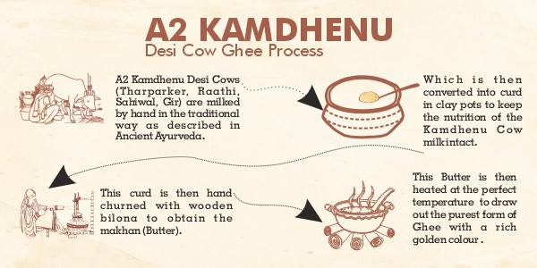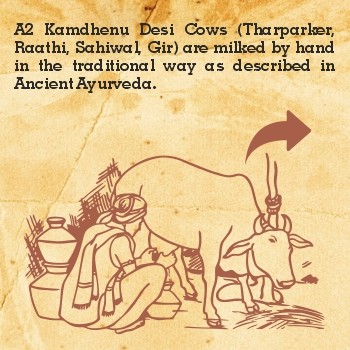 - A2 Kamdhenu Desi Cow ( Tharparker, Raathi, Sahiwal, Gir) are milked by hand in the traditional way as described in Ancient Ayurveda.