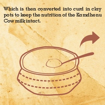 - Which is then converted into curd in clay pots to keep the nutrition of the Kamdhenu Cow milk infact.