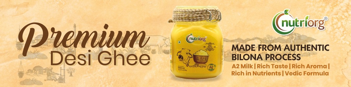 - Nutriorg A2 Rich Desi Cow Ghee made with traditional bilona process wood churning.