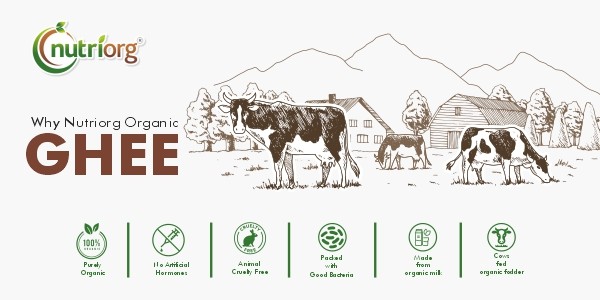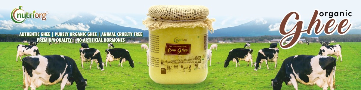 The Nutriorg Certified Organic Cow Ghee is derived from the milk of cows who are fed an organic diet. Our Organic Cow Ghee is made from the milk of stress free cows who are not only fed well but are also allowed to roam freely and feed their calves first. The cows are not exposed to harmful chemical pesticides, artificial hormones that is a common practice in commercial dairies. The quality of the milk changes when cows are stressed, as the hormones that go into the milk change dramatically. Thus we treat our cows with utmost love & care.