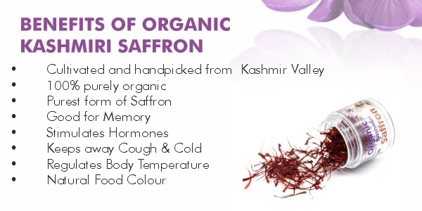 - This wonder spice is grown and processed in organic farms and is 100% purely organic. Kashmiri Saffron is available to you in its purest form.