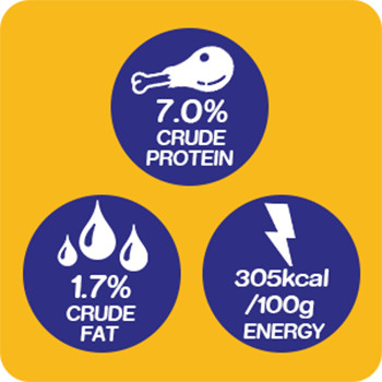 Contains Crude Protein 7%, Crude Fat 1.7% and Energy 305kcal /100g