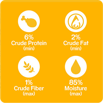 Contains Min. 6% Protein, Min. 2% Fat, Max. 1% Fiber & Max. 85% Moisture.