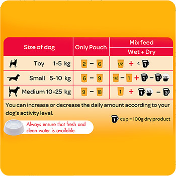 • Dog’s weight (10-25 kg): 9-18 Pouches/ 1 Pouch +150-300g Dry