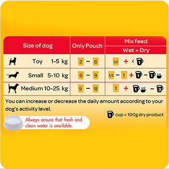 - Dog’s weight (5-10 kg): 6-9 Pouches