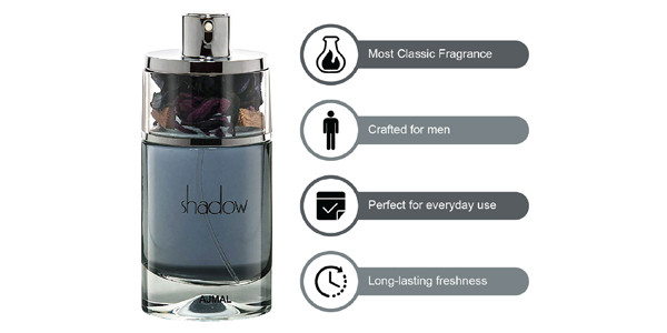 The fragrance with its aromatic and spicy heart, fresh and green top notes is a very fresh and woody fragrance designed for confident and grounded males. shadow’s raw earthy, spicy and fruity notes come from an invigorating blend of pimento leaf, cardamom, clary sage, frankincense, vetiver, sandalwood, patchouli, and musk.
