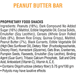 Peanuts (18%), Dark Compound No Added Sugar (16%) (Maltitol, Edible Vegetable Oil, Cocoa Solids, Emulsifier (Soy Lecithin), Cereals (Whole Grain Rolled Oats (8%), Brown Rice Crispy, Quinoa Crispy), Maltitol, Peanut Butter (7%), Black Currants, Edible Vegetable Oil (High Oleic Sunflower Oil), Dietary Fiber (Fructooligosaccharide, Chicory Fiber), Humectant (Glycerine), Oats Bran, Cranberries, Pumpkin Seeds, Flaxseeds, Emulsifier (Soy Lecithin), Binding Agent (Guar Gum), Tribasic Calcium Phosphate, Salt and Citric Acid, Antioxidant (Vitamin C), Vitamin A, C, E.
