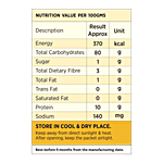 Raw Puri (Energy 370, Total Carbohydrates 80.00, Sugar 1.0 Total Dietary Fibre 3.00,1.0, Total Fat 1.00, Saturated Fat 0.00, Trans Fat 0.00, Protein 10.00, Sodium 140.00,