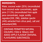 Water, Coconut Water (35% ) (reconstituted From Coconut Water Concentrate) Apple Juice (11.5%) (reconstituted From Apple Juice Concentrate), Sugar, Acidity Regulator (330, 296), Stabilizer, (Pectin (440) Extracted From Citrus Peel) Salt And Anti-Oxidant (300).