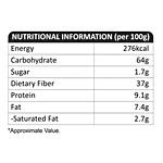 Nutritional Information (per 100g Of Product) Energy 276 kcal Carbohydrates 64g Sugar 1.7g Dietary Fiber 37g Protein 9.1g Fat 7.4g -Saturated Fat 2.7g *approximate Values